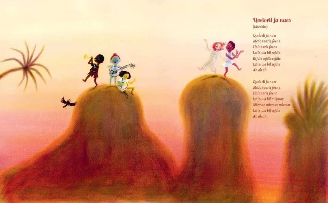 Ga je mee? Samen reizen we door liedjes en verhalen, van Nederland naar Nieuw-Zeeland en van Suriname naar Marokko. We cirkelen hoog in de blauwe lucht op de rug van een arend. We dansen onder het magische noorderlicht en we wanen ons in de zinderende hitte van de woestijn. We laten ons meevoeren door de muziek en de woorden die we niet verstaan, maar toch begrijpen.
